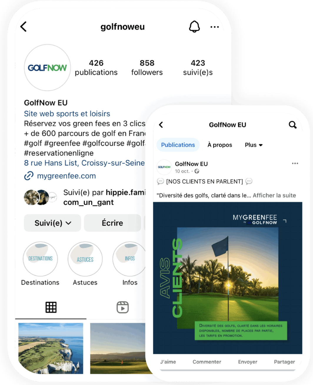 Touchez les golfeurs par le biais d’une publicité géociblée sur les réseaux sociaux en mettant en avant les disponibilités ou les offres de votre golf auprès d’une audience locale enthousiaste.
